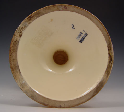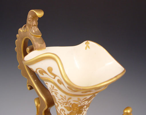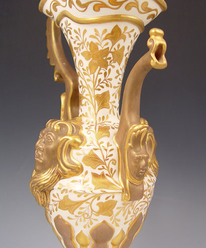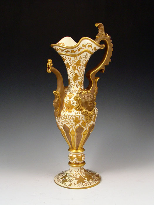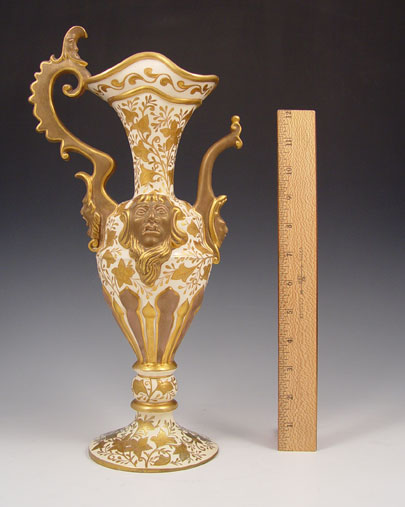 FISCHER BUDAPEST EWER: 19th C early Herend ewer with parcel-gilt, man in the moon, and masqueron design. 15'' tall.