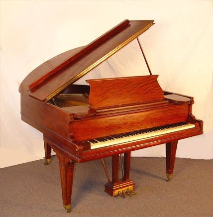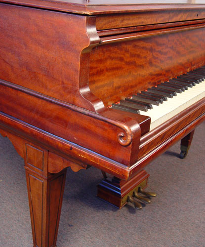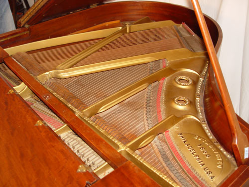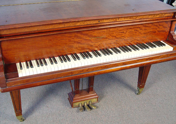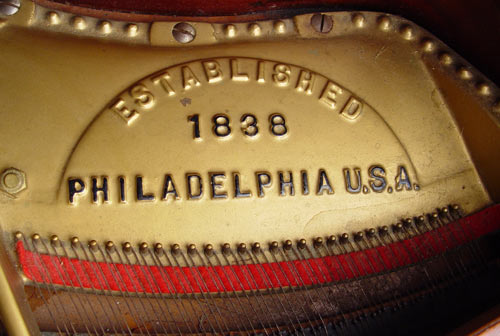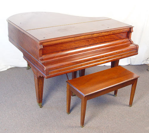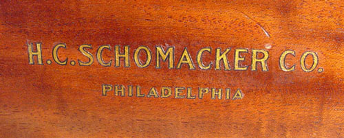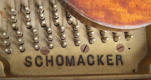 SCHOMACKER BABY GRAND PIANO WITH BENCH: Manufactured by the H. C. Schomacker Co. Philadelphia. Will need tuning, replacement of one string. Sound board is in fine condition. Note overall finish on case, chip to one corner on top. No visible serial number. Measures 38 1/2'' high x 61'' x 56 3/4''.