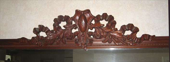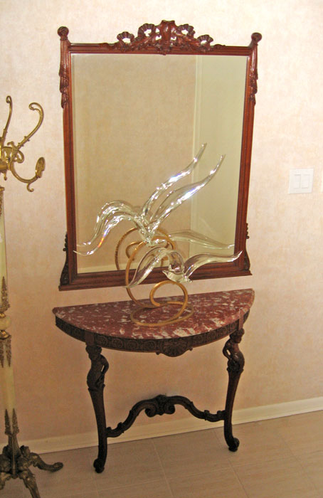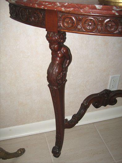CARVED MAHOGANY MARBLE TOP FOYER TABLE WITH MIRROR: Carved figural supports under demi round marble. The table is 31 1/2'' x 39'' X 14 1/2''. The mirror is 45 x 32'' overall.