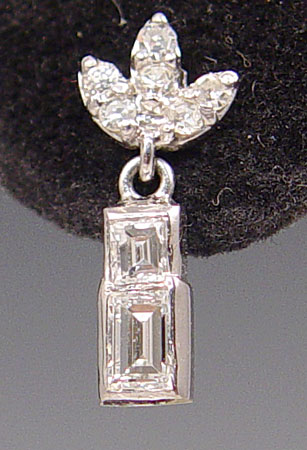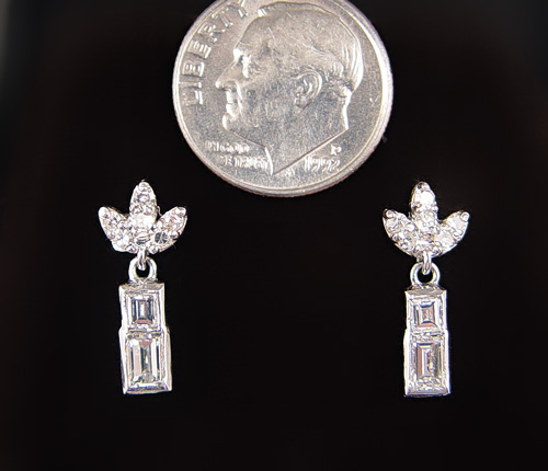 14k WHITE GOLD & BAGUETTE DIAMOND EARRINGS: 14K white gold earrings with 4 baguette cut diamonds and 12 round single cut diamonds. Weight: 1.00 Ctw. Approx. The diamonds average VS in clarity and G-H in color. The diamonds are bezel and prong set. Post and nut closures. Weight approx. 1.8 grams.