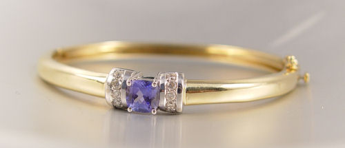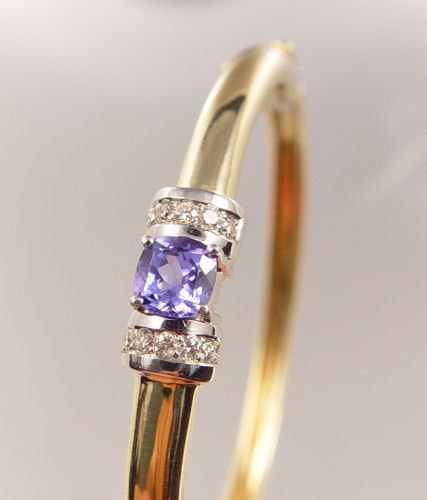 1.5 CT TANZANITE AND DIAMOND BANGLE BRACELET: 14K yellow gold bangle bracelet features a single square cushion cut tanzanite. Weight: 1.50 Ct. Approx. Rated VVS in clarity (Type II), bV in Hue, 4in Tone and 3 in Saturation. Embellished with ten round brilliant cut diamonds. Weight: .30 Ct. Approx. Rated SI in clarity and I-J in color. 21.5 grams. Approx. 2 1/4'' diameter. Hinged clasp. Est. $1000/1350**