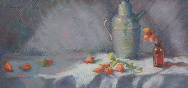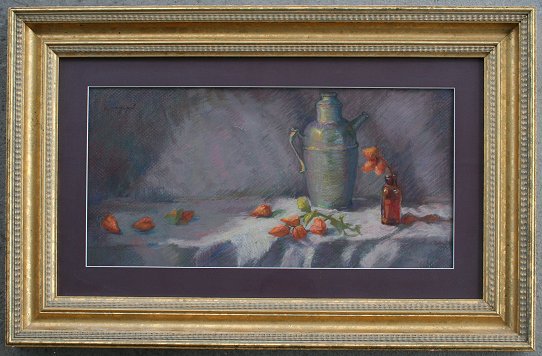KOHN, Coppi, (American, 20th C.): Still Life of flower petals and water kettle, Pastel, sight size 10'' x 21'', signed, fine contemporary framing, 18 1/2'' x 30''.