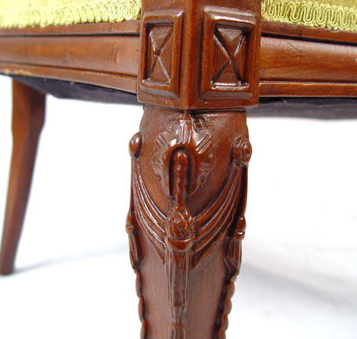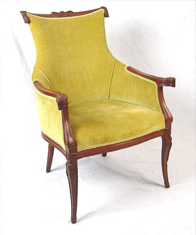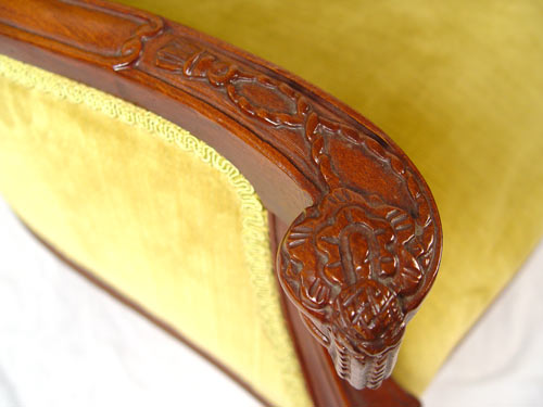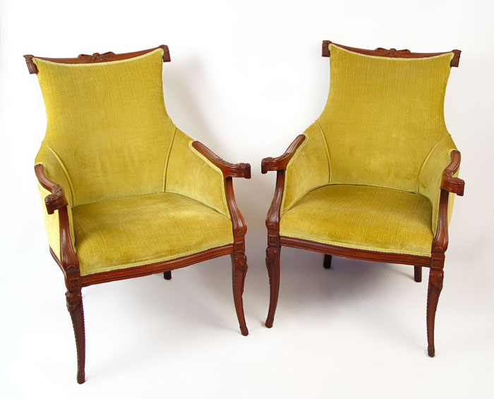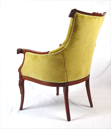PAIR HIGH QUALITY CARVED MAHOGANY FRAMED FRENCH STYLE PARLOR CHAIRS: Carved tassels at the end of the top rails. Green velvet upholstery. Measure approx. 38'' high x 27 1/4'' wide x 30'' deep. Matching sofa sold at previous lot 144a.