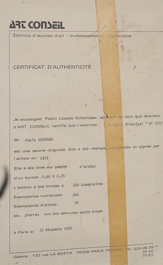 SERRANO, Pablo, (Spanish, 1910-1985): Abstract Composition Mixed Media Print, sight size 20'' x 26'', pencil signed, numbered 217/300, metal frame with wear, 29 1/2'' x 35 1/2''. Art Conseil certificate of authenticity verso.