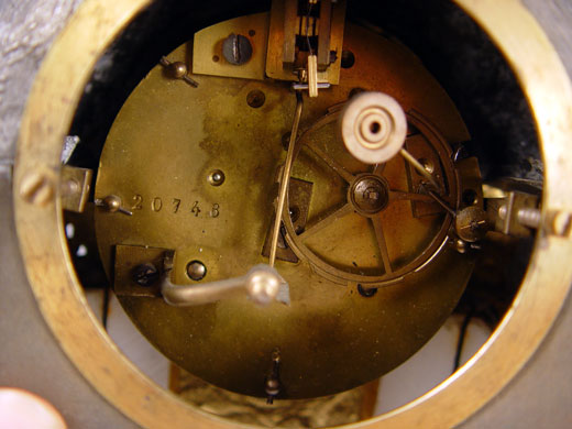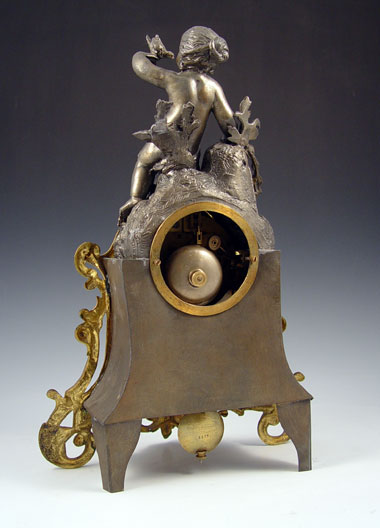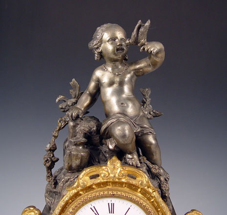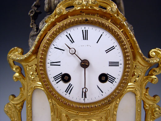 FRENCH FIGURAL GILT BRONZE & MARBLE CLOCK: Gilt bronze front with white marble inserts. Figural bronze top of seated boy with bird. Porcelain face with roman numerals, illegible makers name, note hairlines. Key and pendulum mechanism, no marks. Note wear to gilt finish. Measures 14 1/2'' high x 10'' x 5''. Key and pendulum in office.