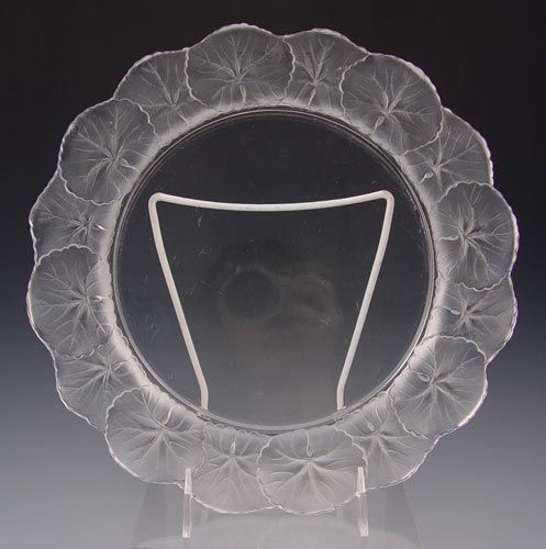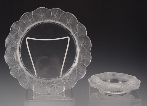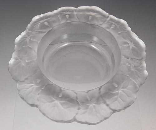 LALIQUE LEAF DISH & BOWL: 2 pieces to include 1) Frosted leaf form rim dish signed Lalique France, 11'' dia. 2) Frosted leaf form rim bowl, unsigned. note scratches on base. Measures 2'' high x 6 3/4''.