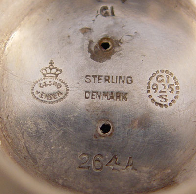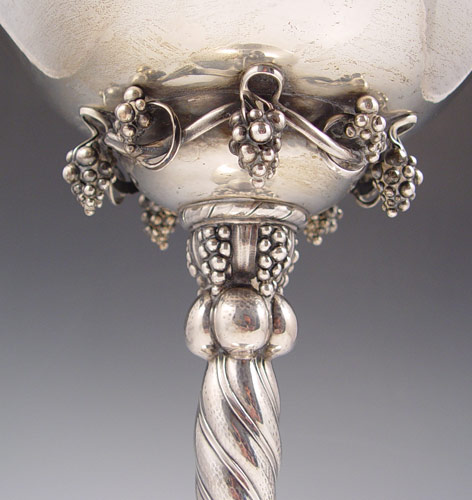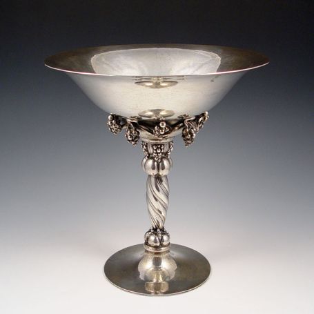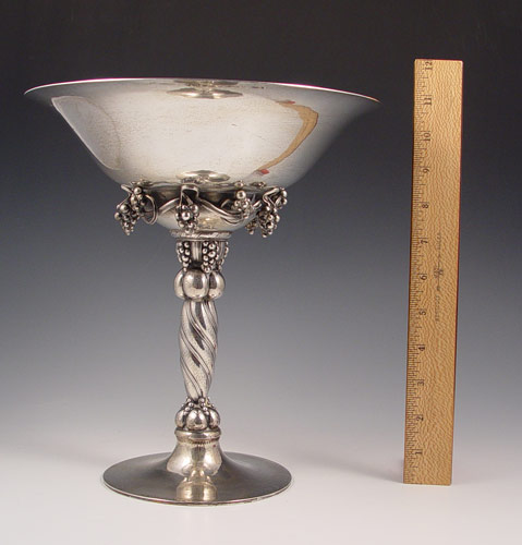 GEORG JENSEN DANISH STERLING FRUIT BOWL TAZZA #264A: Grape motif with twist stem. Marks indicate 1925-1932. Design by Georg Jensen, 1918. Hung with grape leaves, lobed twisted stem. 10 1/2'' high, 10'' dia. Approx. 1192 grams or 38.35 troy oz.