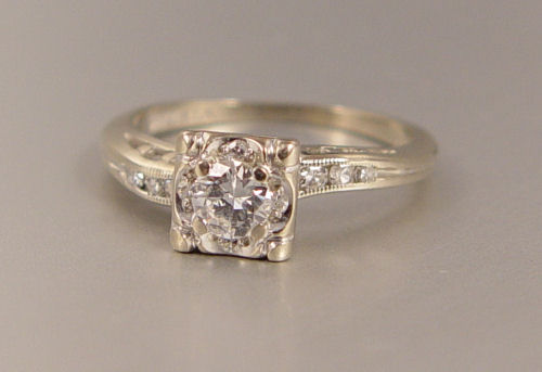 14K & PLATINUM DIAMOND ENGAGEMENT RING: 14K white gold and platinum (head) ring contains one round brilliant cut diamond, approx. .25 Ct., Rated SI2 in clarity and H in color. There are also ten round single cut diamonds, approx. total weight of .10 Ct. Rated VS in clarity and H in color. The diamonds are prong and channel set. Weight: 2.4 grams. Size 5.5