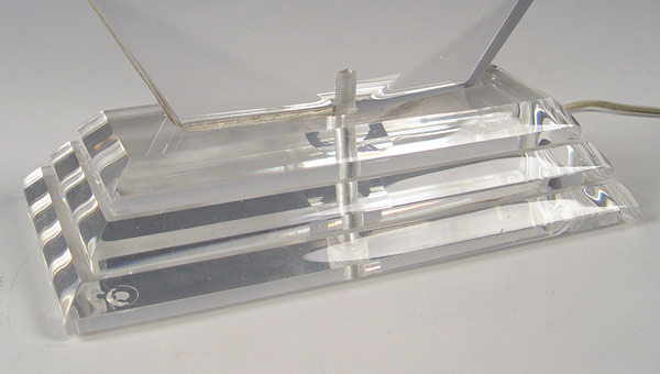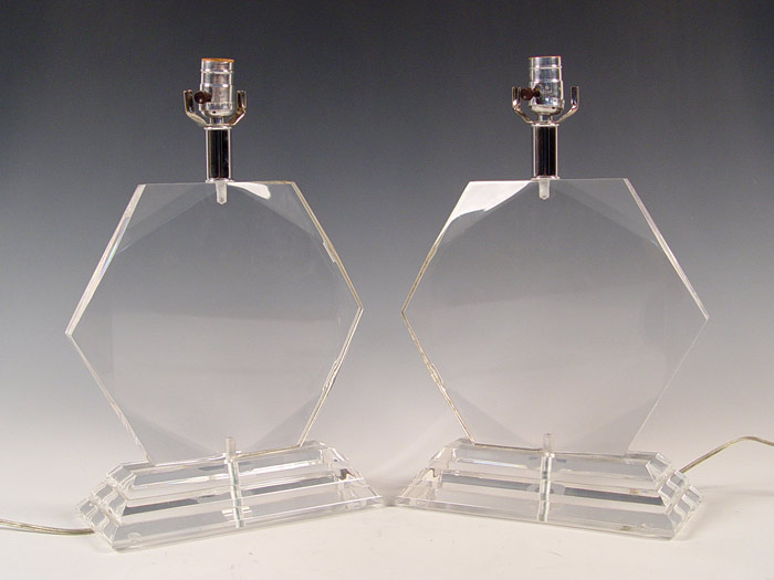 PAIR LUCITE TABLE LAMPS: Octagonal body on three stepped base. The Lucite portion of the lamps is 13'' x 11''. Each with single socket.