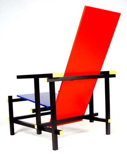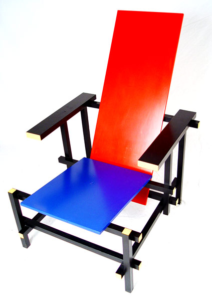 GERRIT RIETVELD DESIGNED RED BLUE CHAIR: Designed by architect / furniture designer Gerrit Rietveld in 1917. Now manufactured by Cassina. Red, blue, black and yellow painted beechwood & plywood. Please note 2 very small dents in seat. 34''h. x 25'' x 32''.