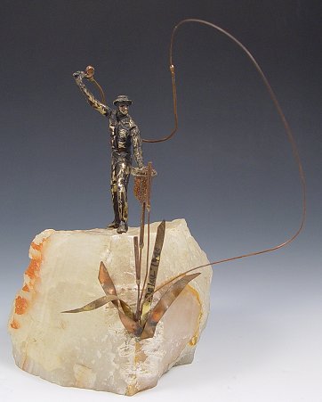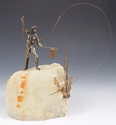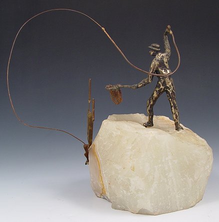 JERE, Curtis, (American, 20th C): Fisherman Flycasting, Metal mounted on stone plinth, signed and dated 1974.
