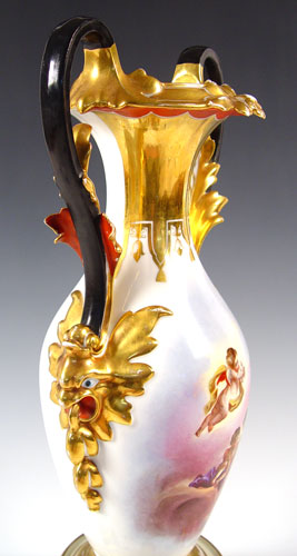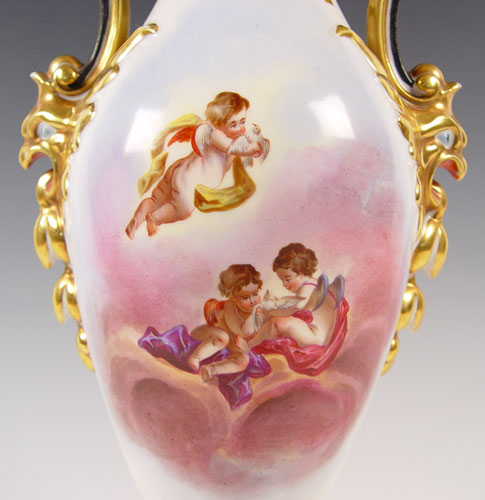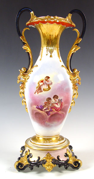 FRENCH LIMOGES PALACE VASE ON STAND: Cherub decorated vase with acanthus leaf and scroll handles joined to the vase with eagle heads. The base bears the backstamp of Tressemann & Vogt, Ca. 1982-1907. Base and stand together are 23'' tall. Please note wear to gold.