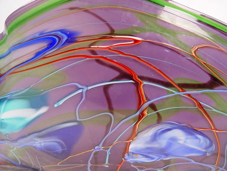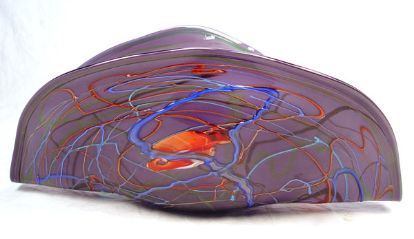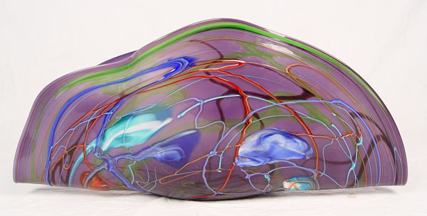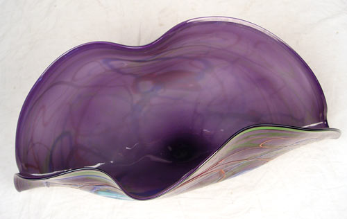CONTEMPORARY PURPLE ART GLASS CLAM SHAPE BOWL: Measures 10'' high x 24'' wide.