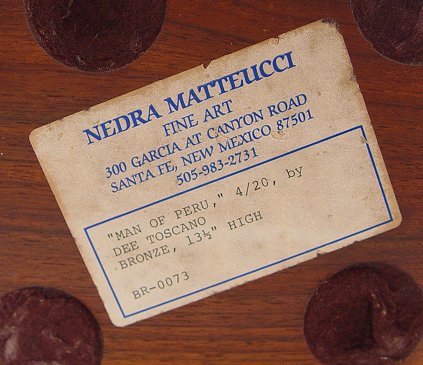 TOSCANO, Dee, (American, 1932-): ''Man of Peru'', Bronze, 13 1/2'' h., 20'' with wooden plinth, signed, numbered 4/20, dated 1984, Nedra Matteucci Gallery label affixed underneath.