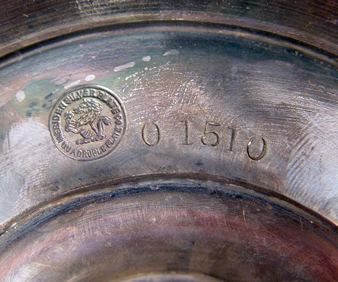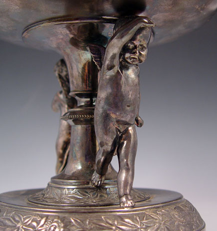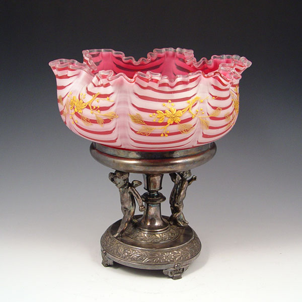CRANBERRY SATIN GLASS NAILSEA BRIDES BASKET WITH CHERUB FIGURAL STAND: Ruffle rim cranberry and white satin glass decorated with yellow enamel, 10 1/2'' dia. The cherubic figural silverplated stand is by Meriden, 7''h. 11'' tall overall.