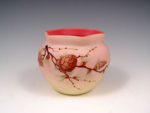 THOMAS WEBB & SONS BURMESE GLASS VASE IN THE JULES BARBE LARCH DESIGN: 3'' tall. Jules Barber created this and many other designs for Webb in 1886-1888. Angie Hudock collection.