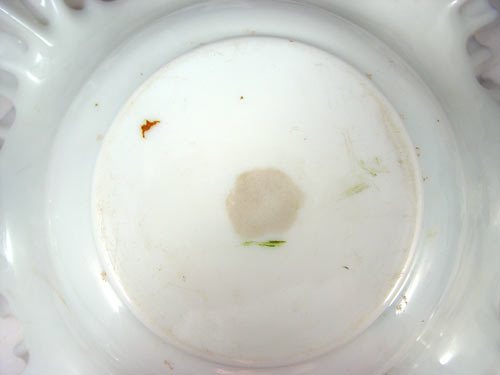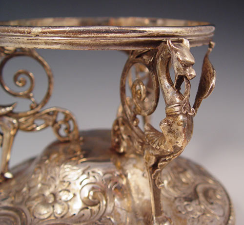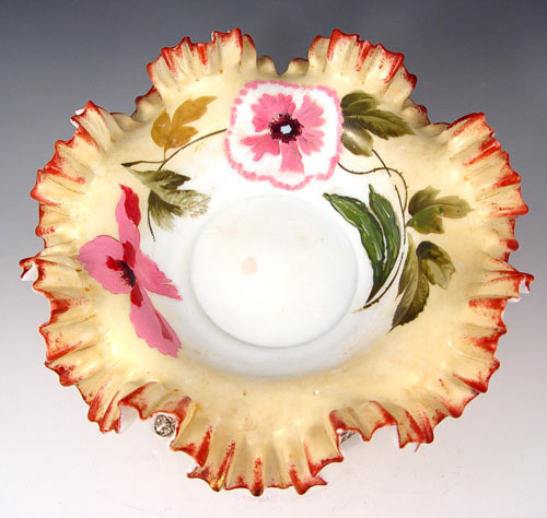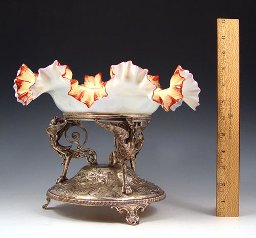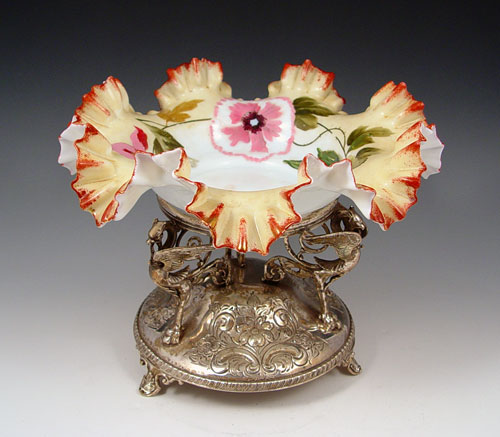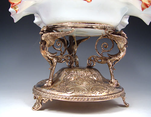 VICTORIAN ART GLASS BRIDES BOWL ON GRIFFIN FIGURAL STAND: Floral painting on opaque glass, The elaborate griffin holder is hallmarked GWS in a shield (possibly George Shiebler), please note one wing missing on griffin. Bowl is 11 1/2'' dia., holder and bowl are 9''h. Angie Hudock collection.