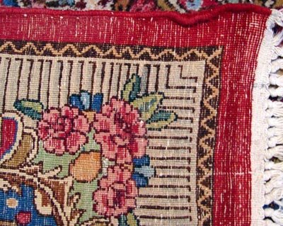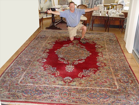 FINE PERSIAN KIRMIN CARPET: Approx 14' 4'' x 9'11''. Rich coloration on red ground, central medallion.