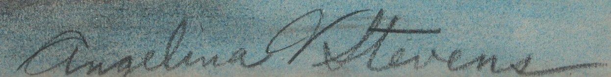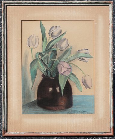 STEVENS, Angelina Vannini, (American, 1898-?): Modernist Still Life of Tulips in a Pottery vessel, Colored Pencil Drawing, sight size 17 1/2'' x 13 1/2'', pencil signed, encased in period painted frame with overall wear, 25 1/2'' x21''. Condition - Browning to paper and the mat. The following is from the ''Daily News'' of Northampton, Massachusetts, courtesy of Susan Rice, curator of the Sellars Collection. Born in Siena, Italy, Angelina Stevens became known for her pastel portraits of children as well as for floral paintings in oil. She came to America at age three and grew up in Quincy, Massachusetts. Quincy was then known for its granite, and her father enrolled her in classes to learn to carve granite. Soon she was doing faces in charcoal, and her talents were so apparent that her teachers arranged her classes so that she could have art lessons every day. At Boston University in 1926 in a night class, she was a student of W. Lester Stevens, whom she married that same year. They had a forty-three year