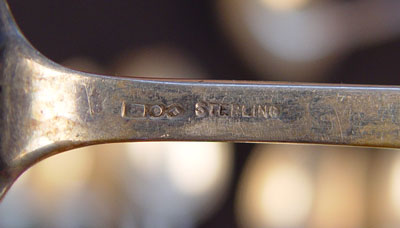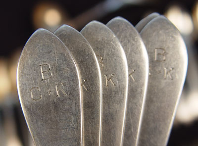 94 PIECE DOMINICK & HAFF STERLING FLATWARE SET: 94 pieces in the pointed antique pattern to include 6 dinner forks (8''), 6 forks (7 1/8''), 12 salad forks (6 1/4''), 12 teaspoons (6 1/8''), 6 gumbo spoons (7''), 4 iced tea spoons(7 1/2''), spoon (5 3/8''), demitasse spoon (4 1/2'' note condition), 10 old French knives (8 3/8''), 2 new French knives (8 3/4''), 13 solid butter knives (5 3/4''), 12 oyster forks (5 1/4''), 8 tablespoons (8 1/4'' note condition on one), solid piece soup ladle (9''). Monogrammed BCK. Approx 98.4 troy oz.