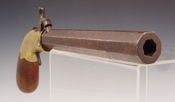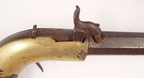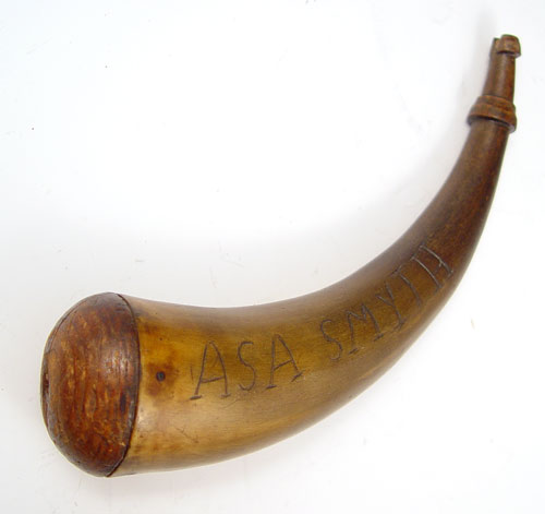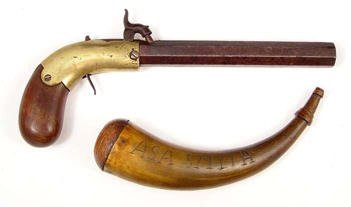 1850'S PERCUSSION PISTOL AND IDENTIFIED POWDER HORN: Circa 1850's American percussion pistol manufactured with a cut down Kentucky rifle barrel. Crude workmanship indicates custom creation. Walnut grip. Action works fine. Note overall condition with dark age, minor surface pitting around nipple. Barrel measures 7'', overall 11 1/2'' long. Comes with 1854 dated powder horn inscribed ''ASA SMYTH HIS HORN 1854''. Note chip, no stopper.