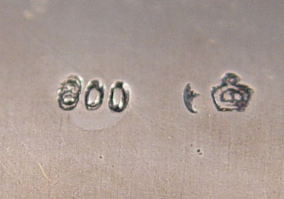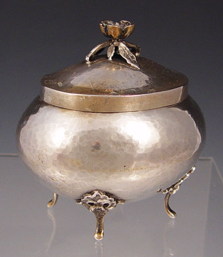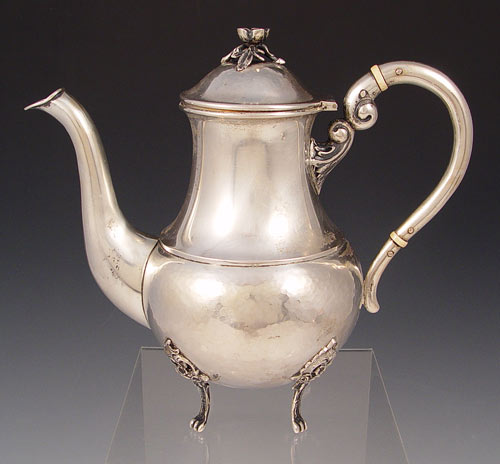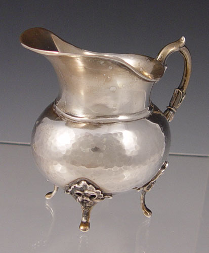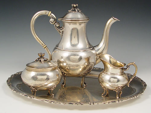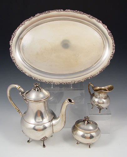 HAMMERED GERMAN SILVER TEA SET: German 800 silver hallmarks, no makers name or hallmark. To include 1) Teapot with flower finial on hinged lid. Measures 8 1/4'' high. 2) Open creamer 3 5/8''. 3) Covered sugar with hinged lid, flower finial, 3 3/4'' high. 4) Oval tray, similar but not exact match, measures 14'' x 10''. Approx 52.7 troy oz.