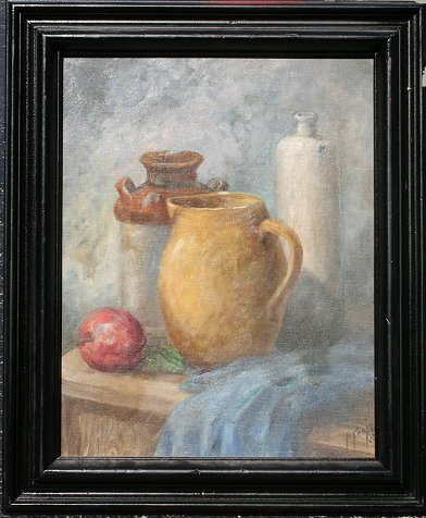 TOOKER, Helen, (American, 20th C): Still Life of pottery vessels, OIL/C, 16'' x 20'', signed, encased in black painted frame, 20'' x 24''.