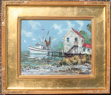 FRITZ, Emmett, (American, 1917-1995): ''The Shrimp Boathouse'', OIL/M, 11'' x 14'', signed, carved and gilded impressionist frame, 17'' x 21''.