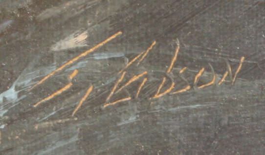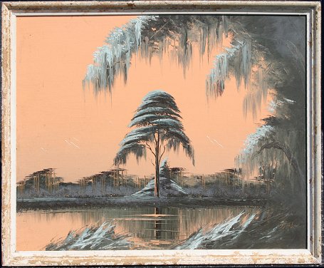 GIBSON, James, (American, 20th C.): Florida Highwaymen Scene with Cypress Tree, OIL/Upson, 24'' x 30'', signed, original frame in poor condition, 26'' x 32''.