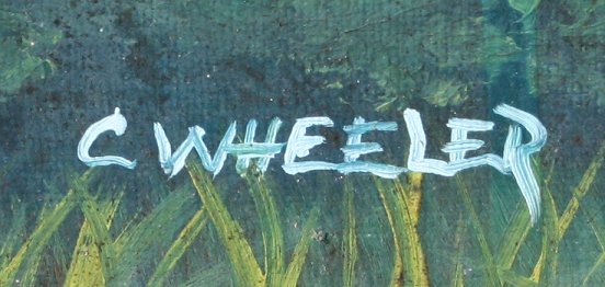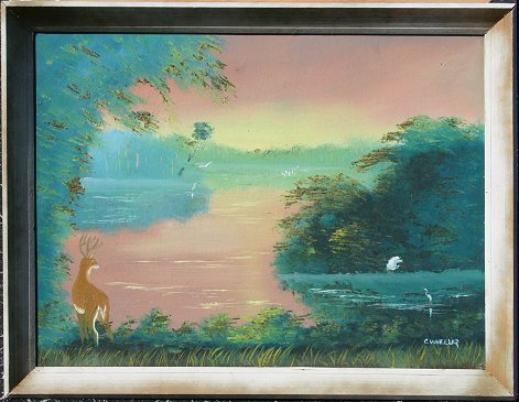 WHEELER, Charles, (American, 20th C.): Florida Highwayman Sunrise Scene with Deer and Egrets, Oil/Upson, 24'' x 32'', signed, encased in original frame with several scattered nail holes, 27'' x 35''. Condition - Several minor gouges upper right corner.