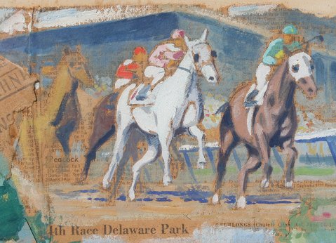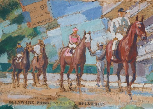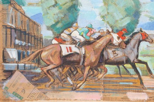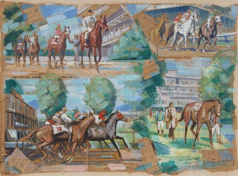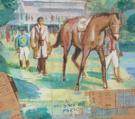 SIMS, Hal, (American, 20th C): An Equestrian/Horse Racing Collage with Gouache, sight size 15 1/4'' x 21 1/2'', signed lower right, dated '63 and marked Paris, encased in a worn wooden frame, 23'' x 29''.