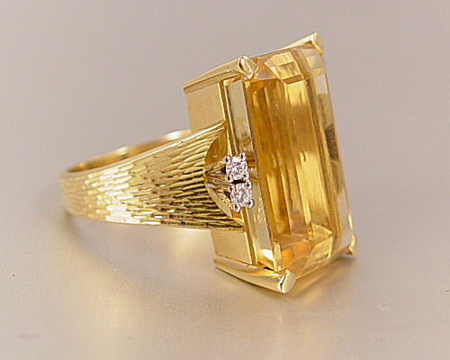 20 CT CITRINE RING WITH DIAMONDS: 18K yellow gold ring contains one emerald cut citrine, approx. 20.00 Ct.. Flanked by four round brilliant cut diamonds. Weight: .12 Ct. Rated VS in clarity and G-H in color. The stone is approx. 3/4'' x 1/2''. All stones are prong set. Weight: 14.1 grams. Size: 7.5