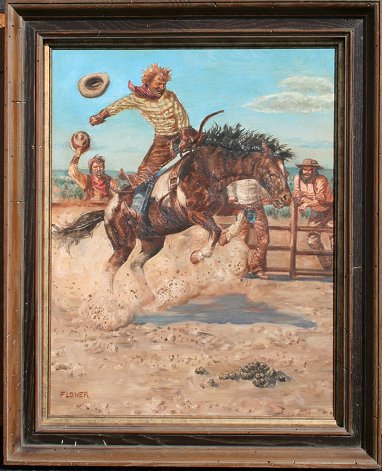 FLOWER, George, (American, 1900-1976): Bronco Busters, OIL/C, 28'' x 22'', signed, western style barnwood frame, 34'' x 28''.