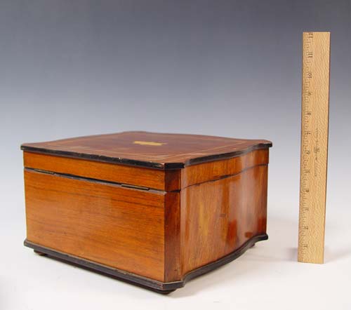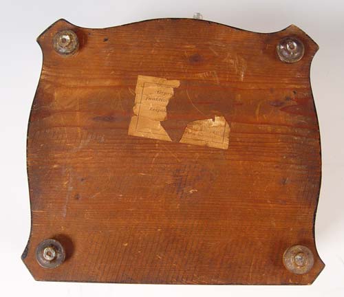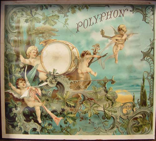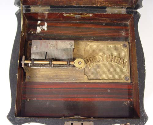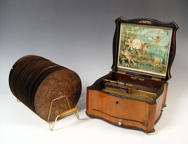 POLYPHON 41R SERPENTINE MUSIC BOX WITH 40 DISCS: Serpentine front case with inlay on top. Front wind mechanism, movement spins. 2 teeth broken. Original lithograph insert. Comes with approx. 40 8'' discs. Measures 6'' high x 11'' x 10''.