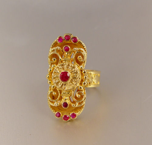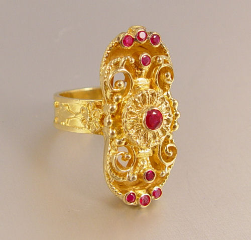22K RUBY RING: 22K yellow gold ring contains 9 round mixed cut rubies (one ruby is chipped). Total weight is .57 Ct. Approx. The rubies are bezel set. Weight: 14.2 grams. Size 7