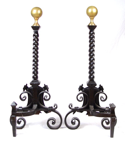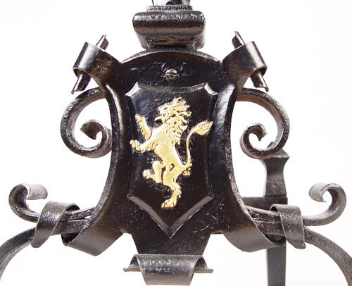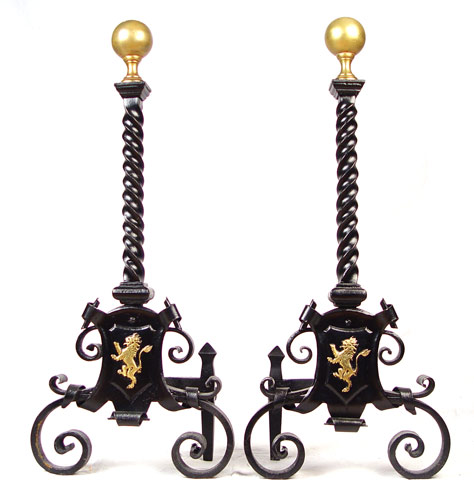 PAIR ENGLISH LION ANDIRONS: Painted cast metal with bronzed ball finials. English lion on shield and scroll design. Repainted at some point, arms for holding wood missing. Measures 28 1/4'' high x 12 1/2'' wide x 8 1/4'' deep.