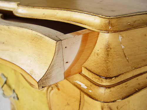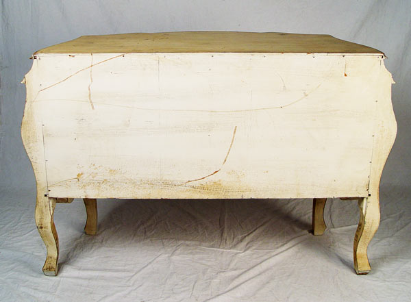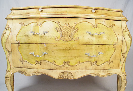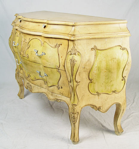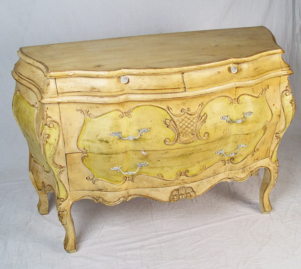 FRENCH STYLE PAINT DECORATED BOMBAY CHEST: Two half length drawers over 2 full length drawers. 20th C. Measures 33'' high x 48 3/4'' wide x 20'' deep.