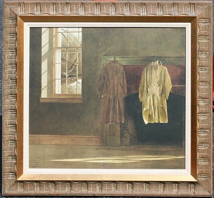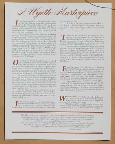 WYETH, Andrew, (American, 1917-): ''The Quaker'', Collotype, sight size 19 3/4'' x 21 3/4'', in original package and carved frame, laid down verso with A Wyeth Masterpiece authentication from Thomas Hoving of Triton Press and Joseph E Levine, 27 1/2'' x 29 1/4''. Condition - Slight bubble in upper right corner.