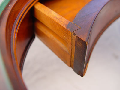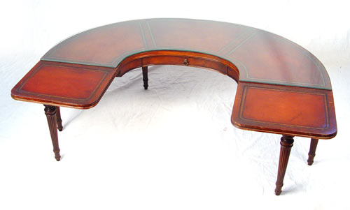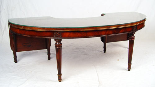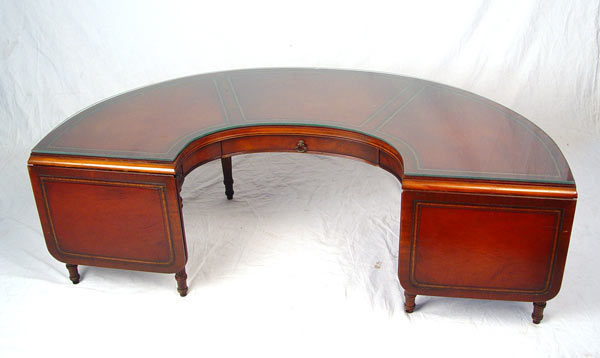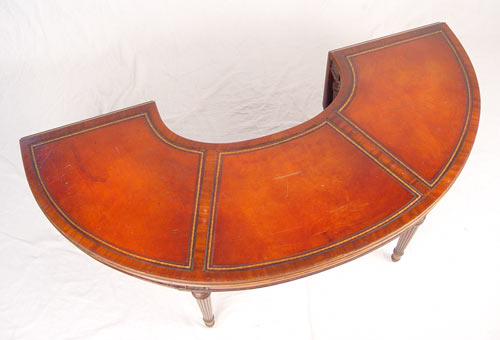 MAHOGANY HALF MOON COFFEE TABLE: Drop leaf extensions on front. Custom glass top. Measures 16'' high x 48 1/4'' wide x 24'' deep.