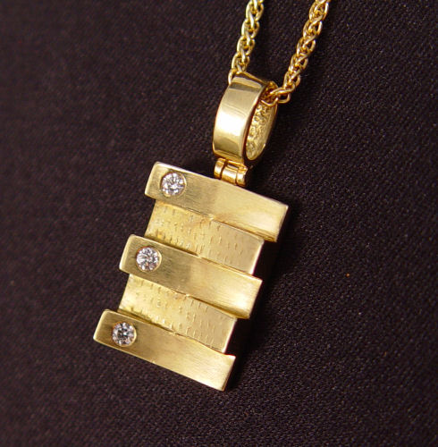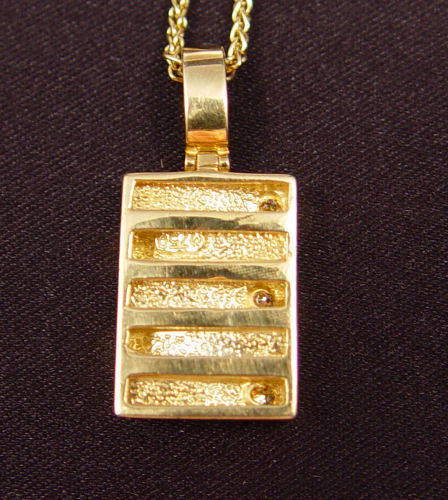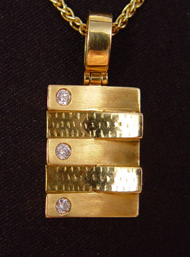 18K GOLD & DIAMOND PENDANT NECKLACE: 18K yellow gold pendant contains 3 round brilliant cut diamonds, total weight approx. .12 Ct., rated VS in clarity and G-H in color. The diamonds are deep set. Suspended by a 14K yellow gold 16'' foxtail chain. Weight: 10.5 grams. Est. $550/625**