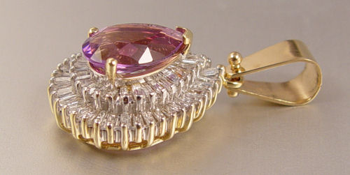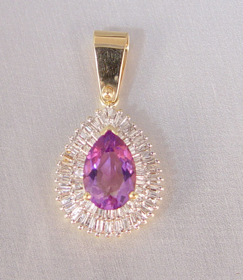 2.50 CT. AMETHYST AND 1.30 CTW DIAMOND PENDANT: 14K yellow gold pendant contains one pear shaped mixed cut amethyst, weight approx. 2.50 Ct.. Framed in two tiers of 66 baguette cut diamonds, total weight approx. 1.30 Ct. Rated SI-I1 in clarity and H-I in color. All stones are prong set. Weight: 7.0 grams.