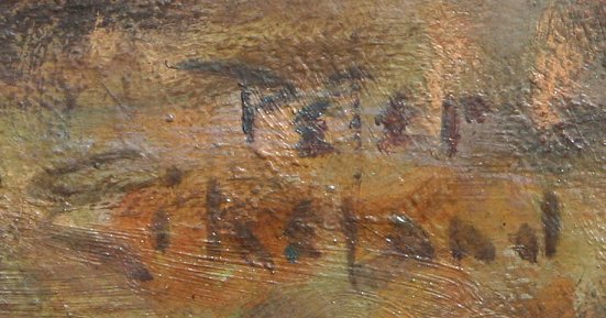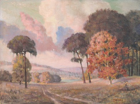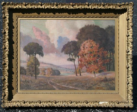 AUTUMN PLEIN AIRE LAKE SIDE LANDSCAPE PAINTING: OIL/Canvas Board, 18'' x 24'', signed Pikeland?, encased in later gesso gilded frame with wear and over-paint, 25'' x 31''. Condition - Cracklure throughout, several flecks of paint with abrasions.