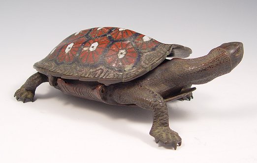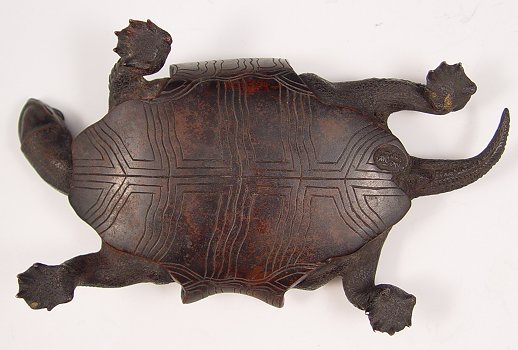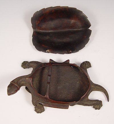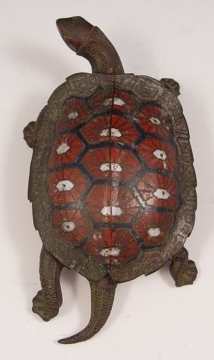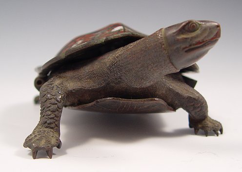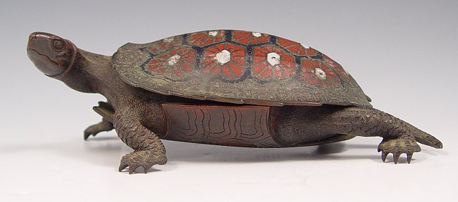 JAPANESE BRONZE CHAMPLEVE TURTLE BOX: Champleve back with hinged lid, note hinge broken. Signed in characters near tail. Measures 2 1/4'' high x 7 1/2'' x 4 1/4''. Note condition of enamel.