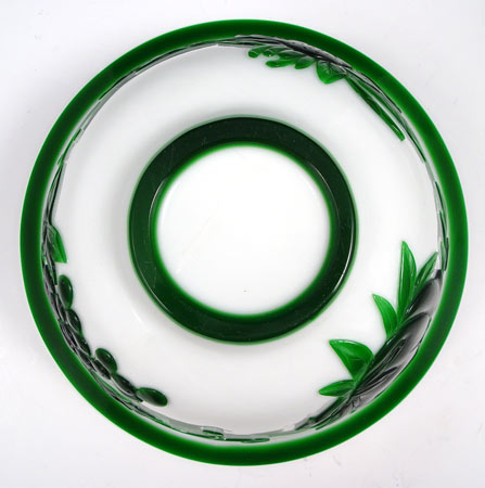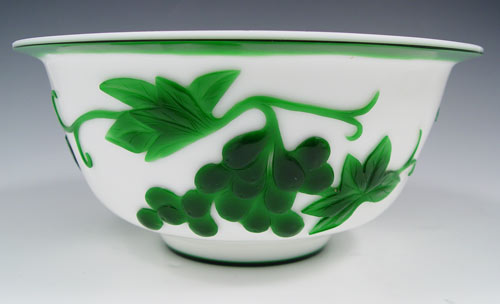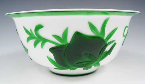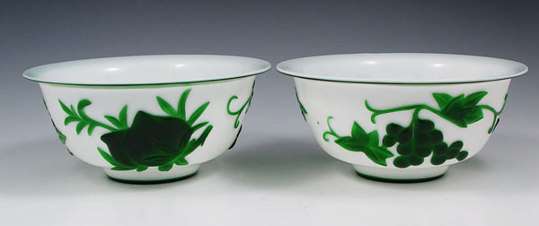 PAIR CHINESE PEKING GLASS BOWLS: Green over white, 3 1/2'' high x 8 1/4'' dia.