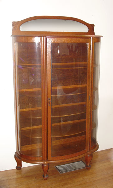 LATE VICTORIAN GOLDEN OAK TRIPLE BOW FRONT CHINA CABINET: Mirror backsplash, original wood shelves. Refinished condition. Measures approx. 69 1/2'' x 42'' x 17''