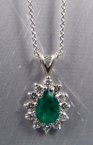 1.65 CT. EMERALD & .75 CTW DIAMOND PENDANT NECKLACE: 14K white gold necklace contains one pear shaped emerald, approx. weight 1.65 Ct. Rated SI in clarity (Type III), G in Hue, 5 in Tone and 4-5 in Saturation. Framed by 20 round brilliant cut diamonds, approx total weight .75 Ct., rated SI in clarity and G-H in color. The emerald and diamonds are prong set. 14K white gold anchor link chain. Weight: 4.7 grams. Est. $1500/1600**