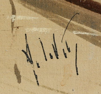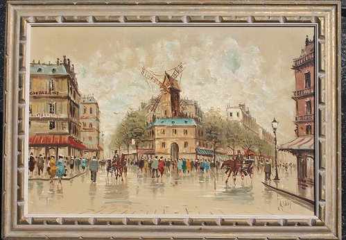 DEVITY, Antonio, (Italian, 1901-): Parisian Street Scene, OIL/Canvas, 24'' x 36'', signed, original carved frame, 30'' x 42'', Devity Studios stencil verso. Condition - Several visible taped repairs to tears, several indentations, needs minor work and possible cleaning.