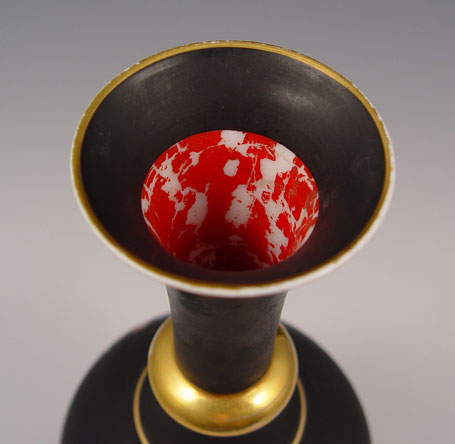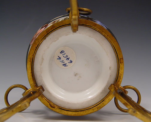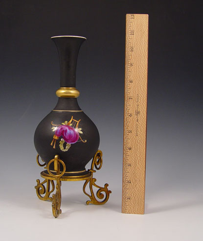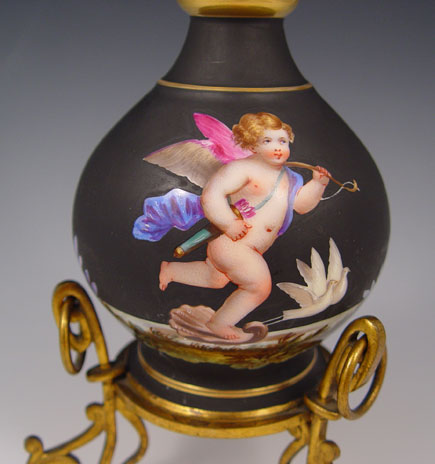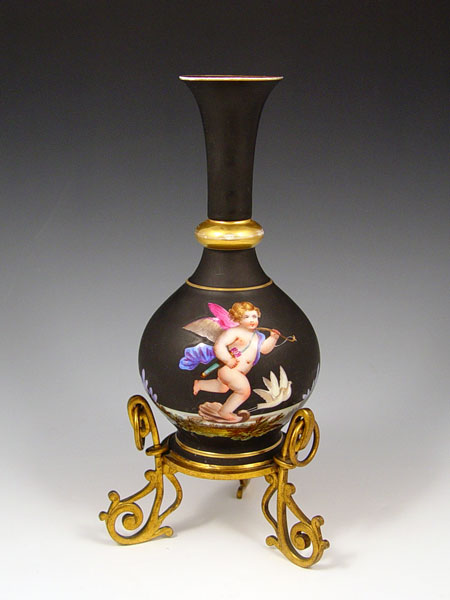 OLD PARIS METAL MOUNTED CHERUB DECORATED PORCELAIN VASE: Porcelain raised on original metal legs and base. Please note wear to gold on ring of neck. 11 3/4''h.