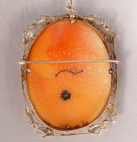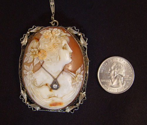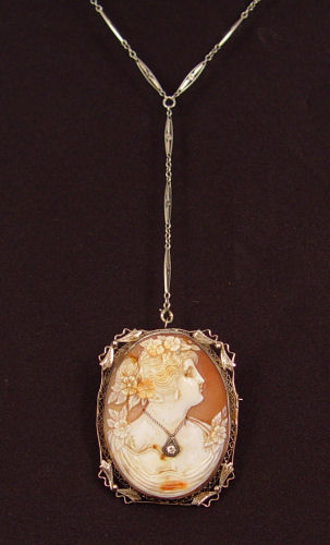 LARGE 14K CAMEO BROOCH / NECKLACE: Carved shell cameo framed in 14K white gold. Oval shaped shell cameo depicts a female bust in profile wearing 14K necklace with one .05 Ct. diamond. Frame is filigree and bows. Bar pin and pivot bail. Attached is a 14K white gold fancy fetter and five chain. Cameo approx. length: 2 1/4'' x 1 1/4''. Overall length with chain is 30''. Weight: 22.5 grams.