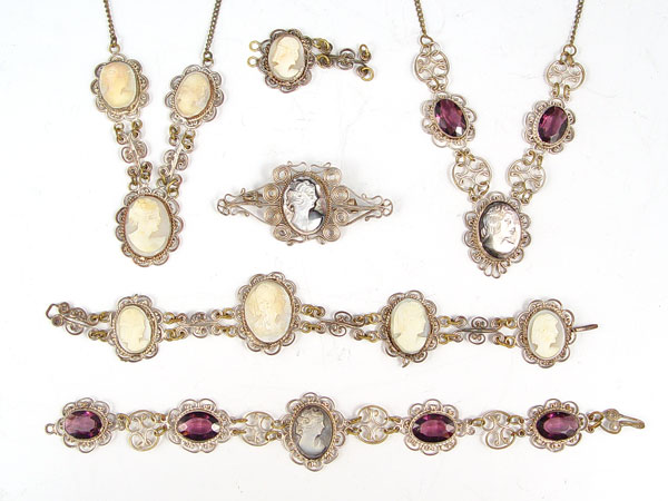 VINTAGE CAMEO NECKLACES AND BRACELETS: 1) Lavalier type necklace with matching bracelet. Shell carved cameos, silver wire, the bracelet has an extra link. 2) Abalone cameo lavalier type necklace with amethyst?. Matching bracelet and brooch.